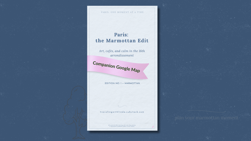 A custom Google Map with all curated stops from Paris: The Marmottan Edit. Wander the 16th with curated cafés, museums, and more.